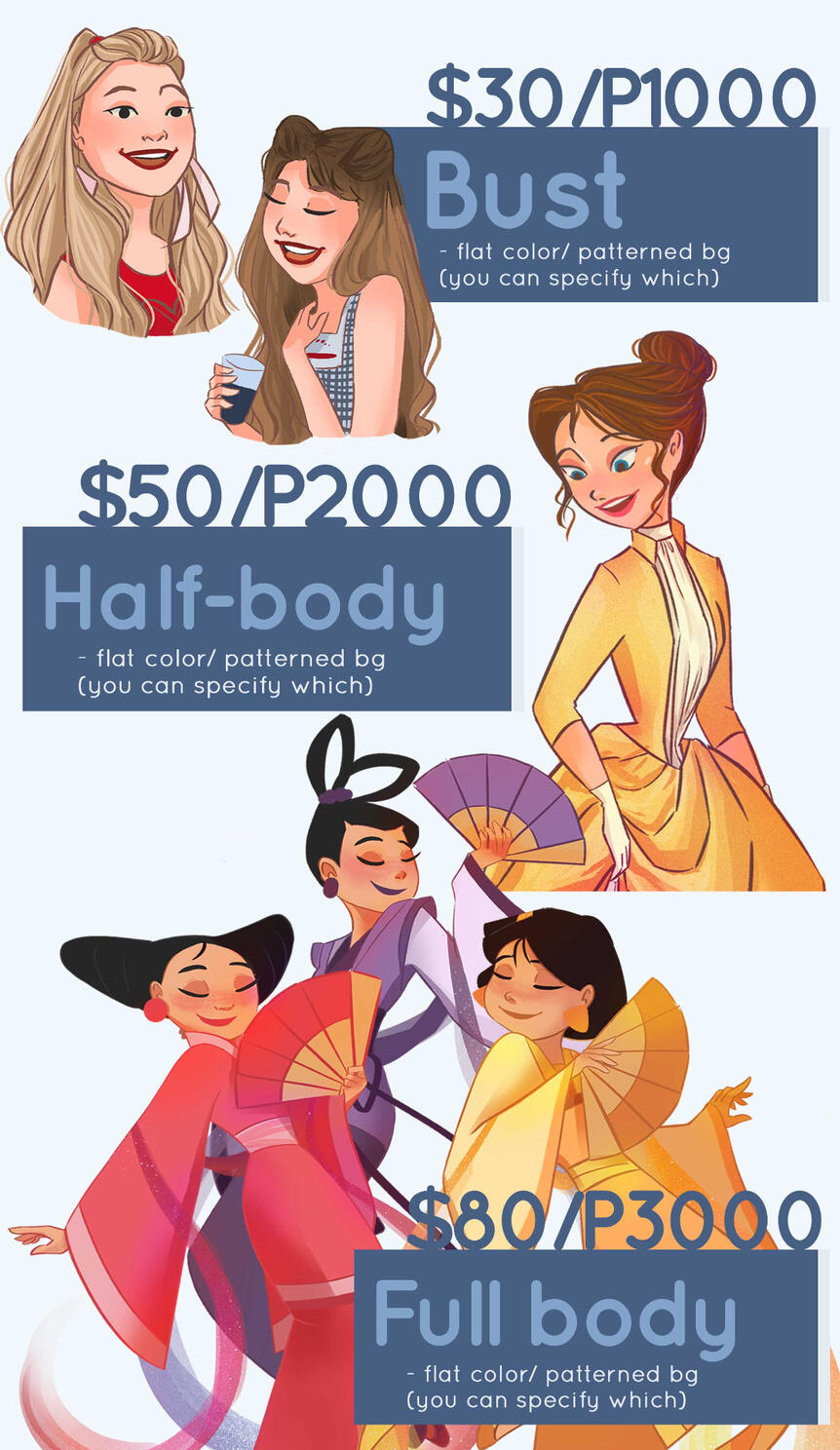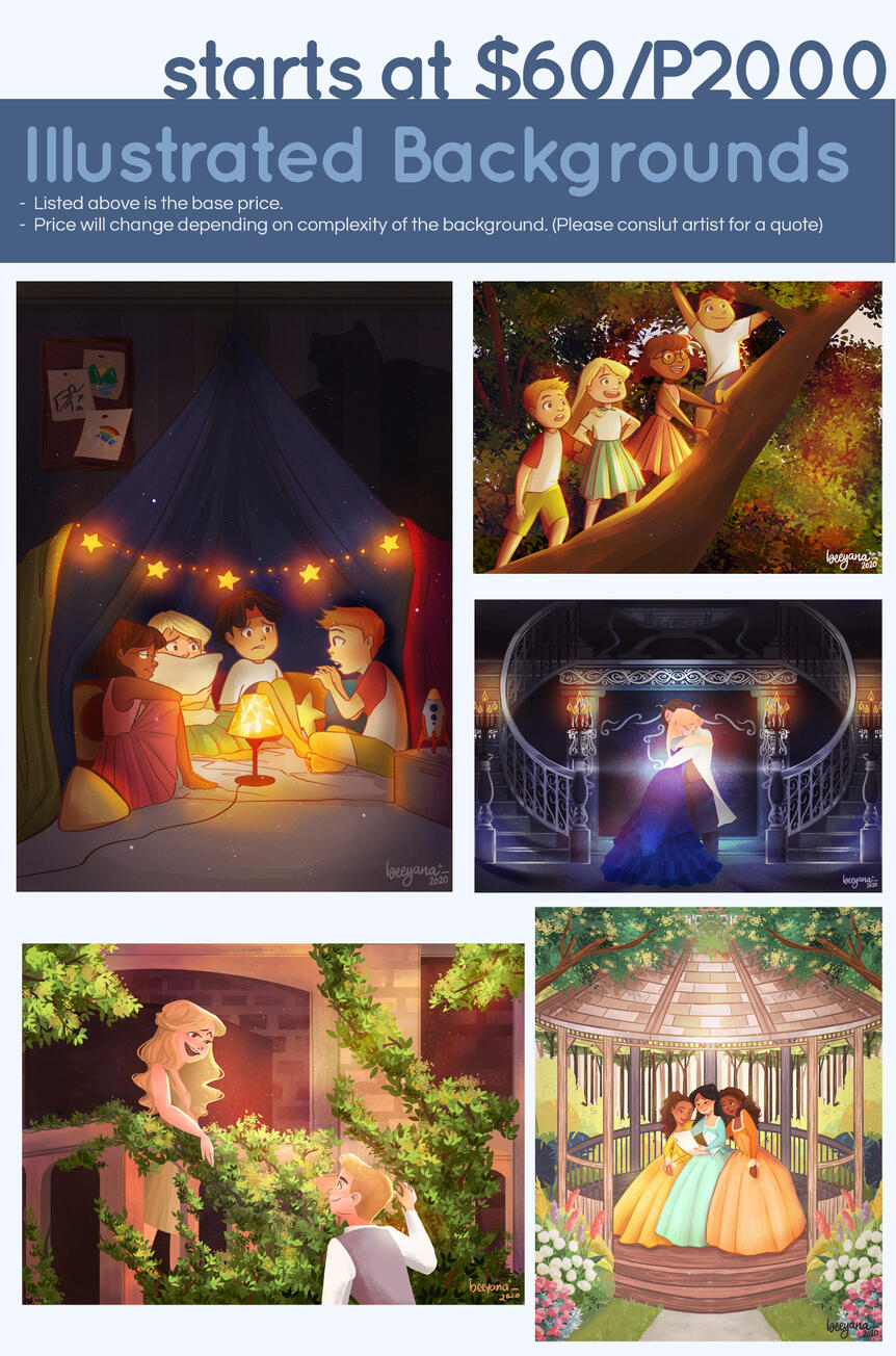 Price for illustrated backgrounds is an additional to character commissions with a detailed background.Prices are subject to change without prior notice.